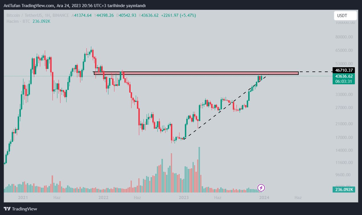 Spot Bitcoin ETF’si hakkında gelebilecek olumlu haberler BTC’nin 47 bin dolar seviyelerine kadar yükselmesini sağlayabileceği gibi olumsuz bir gelişmenin olması 40 bin dolara kadar bir düşüş getirebilir.