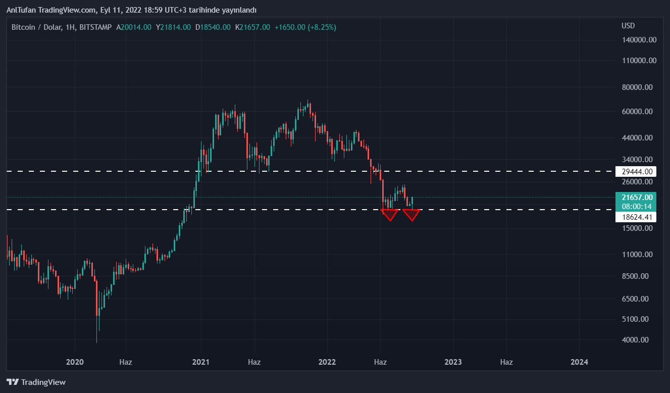 Bir trend dönüşüm formasyonu olarak adlandırılan 2’li dip oluşturan BTC, ilerleyen haftalarda 25 bin dolar seviyelerine doğru bir yükseliş yaşayabilir.