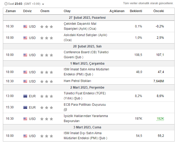 Bu verilerin haricinde önümüzdeki hafta 3 Mart tarihinde ülkemizde enflasyon oranları açıklanacak. Şuan itibariyle enflasyon verisinde beklentilerin yüzde 53.50 olduğu görülüyor.