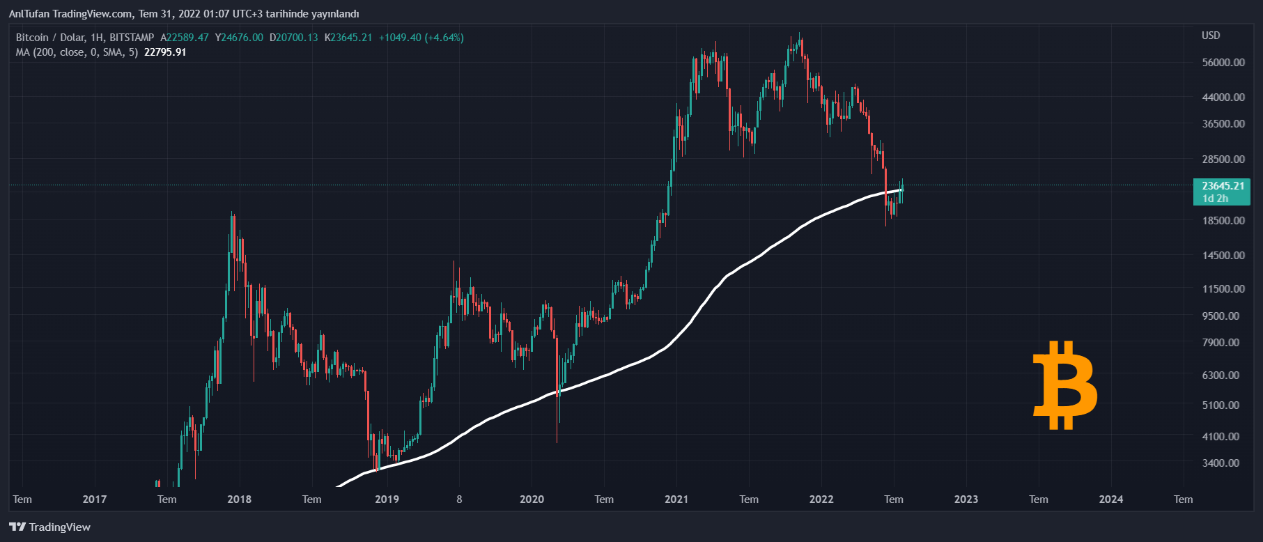 Yarın gece TSİ 03.00‘da gerçekleşecek olan kapanışlarda Bitcoin‘in 200 haftalık hareketli ortalama seviyesi olan 22.700 doların üzerinde olması gerekiyor.