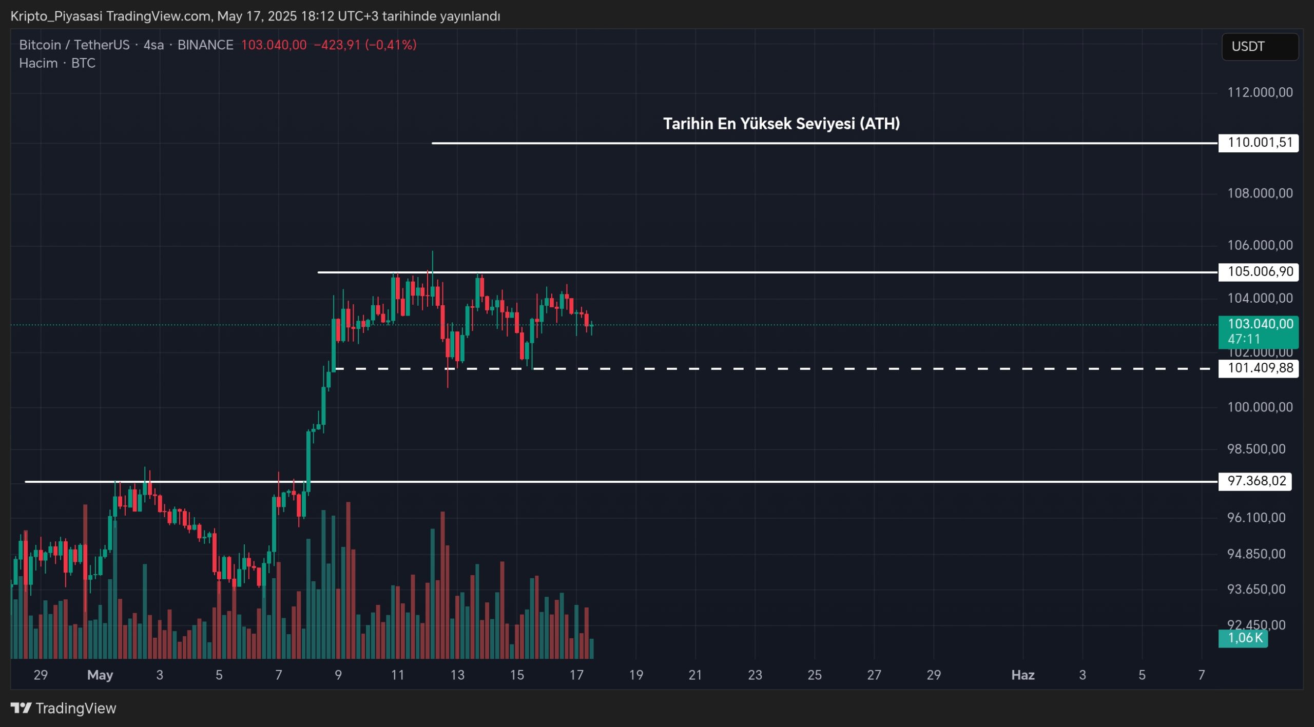 Bu dar aralığının alt bandının 101.500 dolar, üst bandının ise 105 bin dolar olduğu gözlenmekte. Her ne kadar bu 2 seviyenin altına ve üstüne iğneler atılmış olsa da, net bir kırılım henüz gerçekleşmedi.