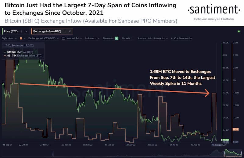 Başarılı bir veri sağlayıcısı olan Santiment’in aktardıklarına göre, 1.69 milyon adet Bitcoin (şu anda 33,5 milyar dolara eşdeğer) 7 ila 13 Eylül tarihleri arasında kripto para borsalarına taşındı.
