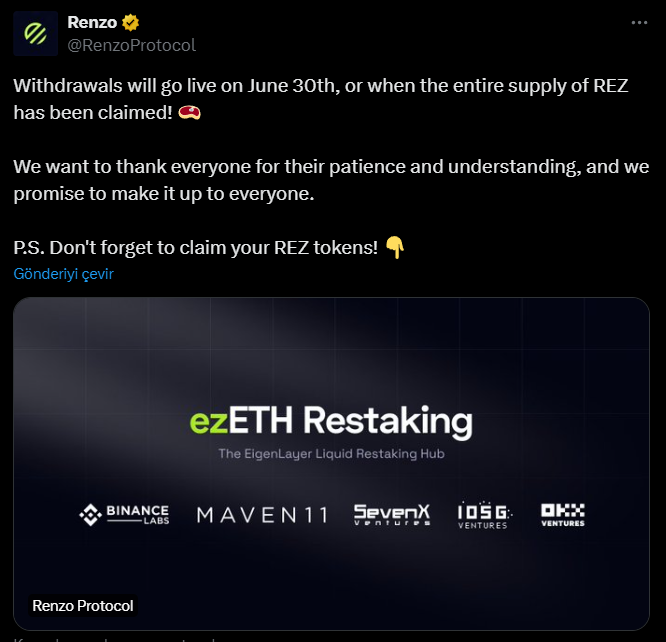 Bu gelişme REZ isimli altcoin’in fiyatını etkilemese de, okurlarımızın Renzo Protocol resmi X/Twitter hesabı üzerinden yapılan paylaşımlardaki bağlantılara tıklamamaları önerilir.