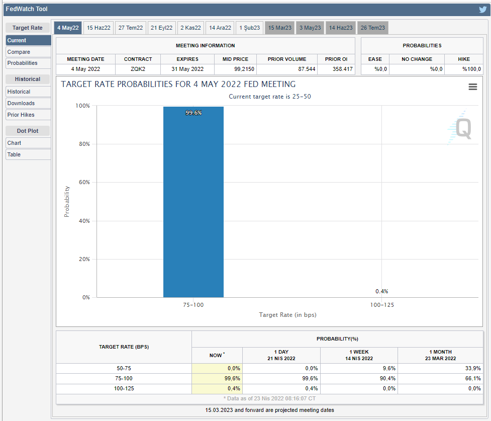 CME Group‘un paylaştığı verilere göre ise piyasalar üzerinde faiz artış beklentisinin an itibariyle 75 baz puana ulaştığı göze çarpmakta.