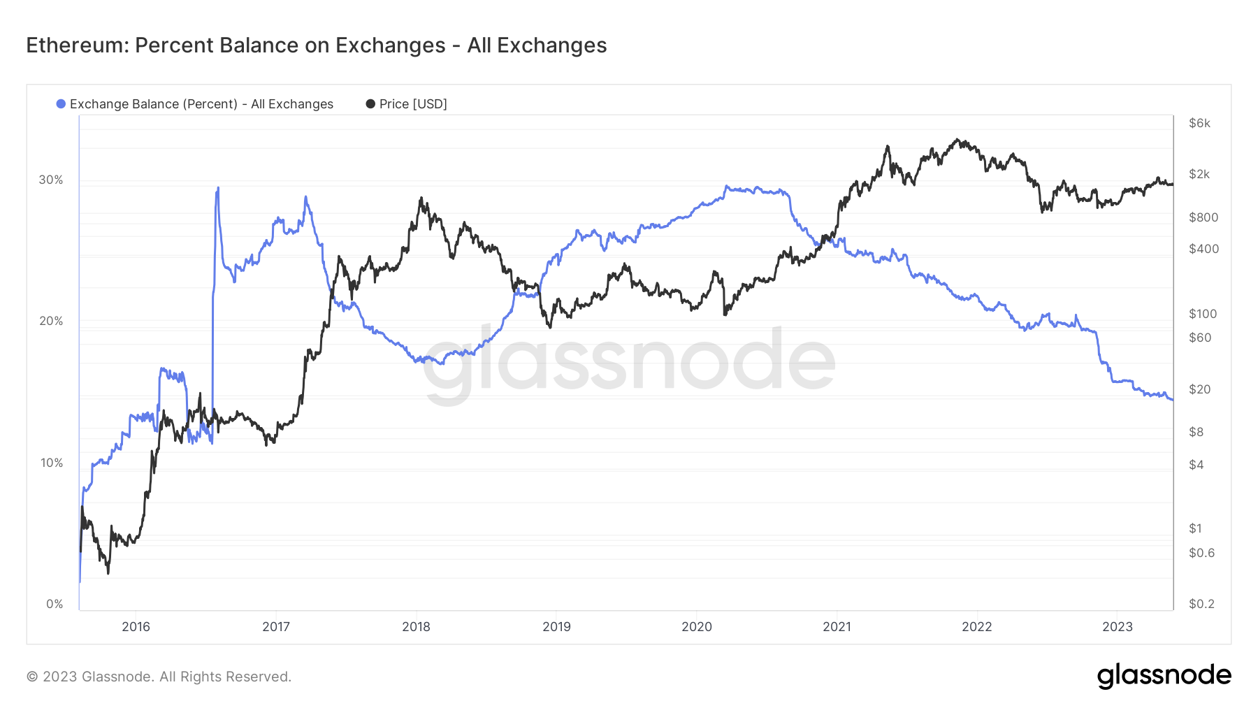 Paylaşılan blockchain verileri tüm ETH tarzının toplam sadece yüzde 14,85’inin merkezi borsaların sahip olduğu cüzdanlarda tutulduğunu gösteriyor.