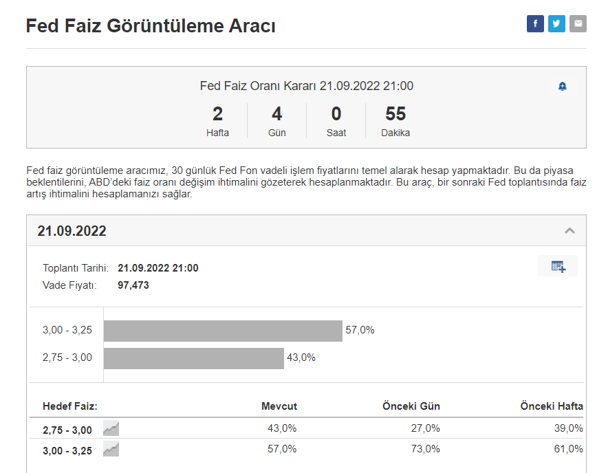 75 baz puanlık faiz beklentisi sadece bir günde yüzde 73 seviyesinden yüzde 57’ye kadar gerilerken, 50 baz puanlık faiz beklentisi ise yüzde 27’den yüzde 43’e yükselmiş durumda.