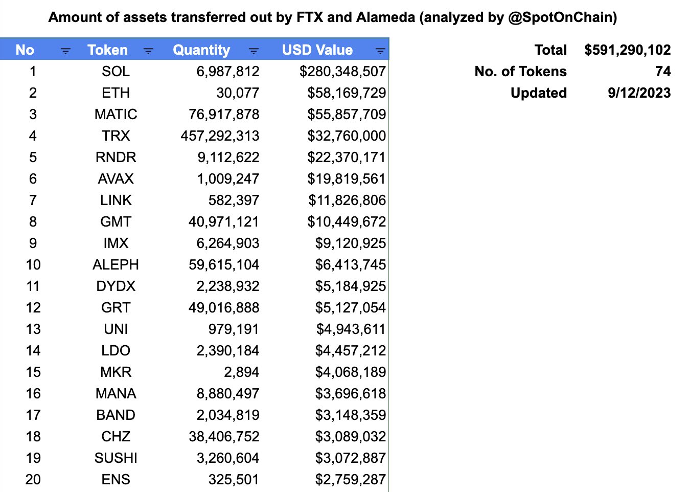 Geçtiğimiz yıl iflas eden kripto borsası FTX ise elinde kalan varlıkları kademe kademe tasfiye etmeye devam ediyor. FTX son 4 gün içerisinde 19 adet altcoin’de satış yaptı.