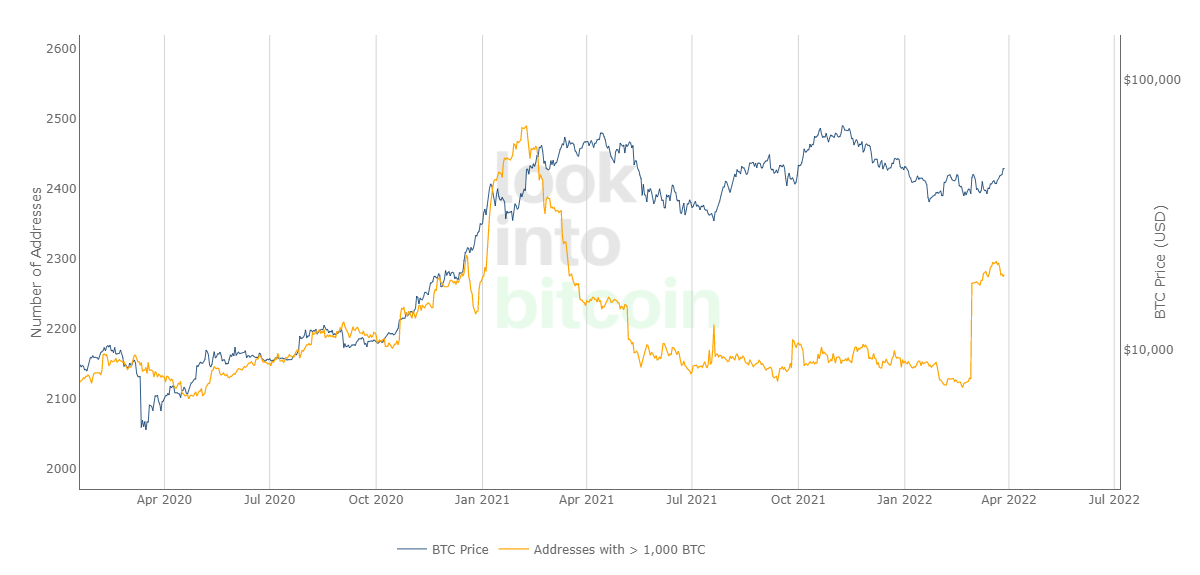 1000 adetten fazla Bitcoin tutan cüzdan adreslerinin sayısında halen bir düşüş bulunmuyor. LookİntoBitcoin’in paylaştığı verilere göre balinalar BTC almaya devam ediyor.