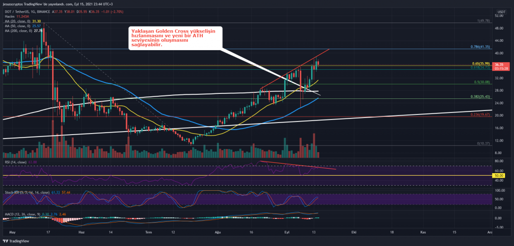 7 Ağustos günü oluşan Death Cross’a rağmen günlük grafikte beyaz trend çizgisi üzerine çıkan DOT’un yaşadığı yükselişle birlikte Bitcoin’de de olduğu gibi bir Golden Cross oluşturmaya hazırlandığı görülüyor. Fibonacci düzeltmesi açısından önemli olan 34,73 – 35,99 dolar aralığı üzerine çıkan DOT, beklenen kesişimle birlikte yükseliş hareketini hızlandırabilir.