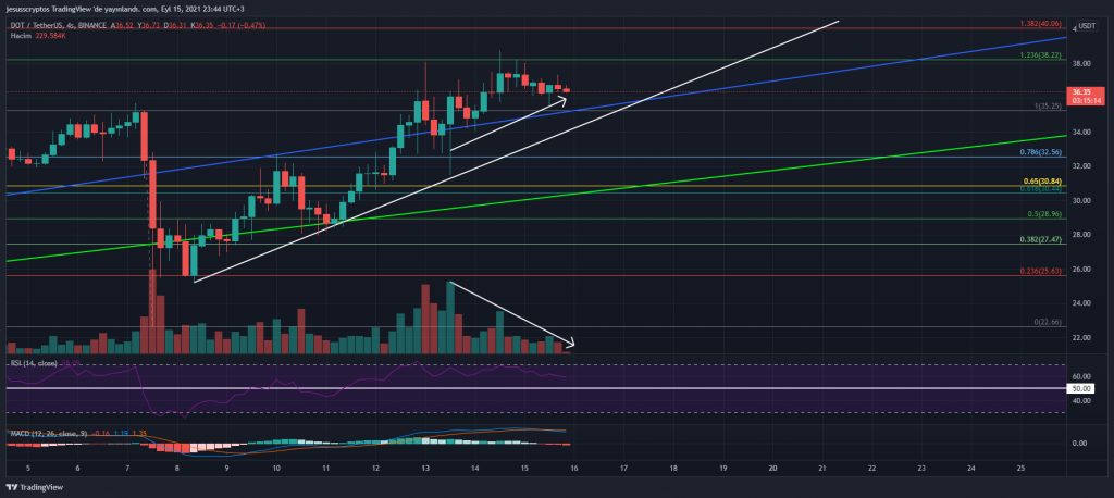 4 saatlik grafikte incelediğimizde DOT fiyatının günlükte RSI ile olan uyuşmazlığını burada hacim tarafında yaşadığı görülüyor.