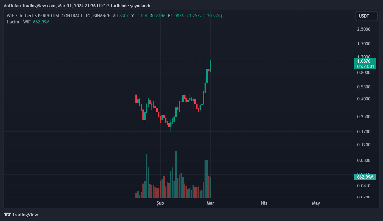 Son yükselişleriyle 1 dolar seviyesini de aşmayı başaran WIF, an itibariyle 1.08 dolardan işlem görüyor.