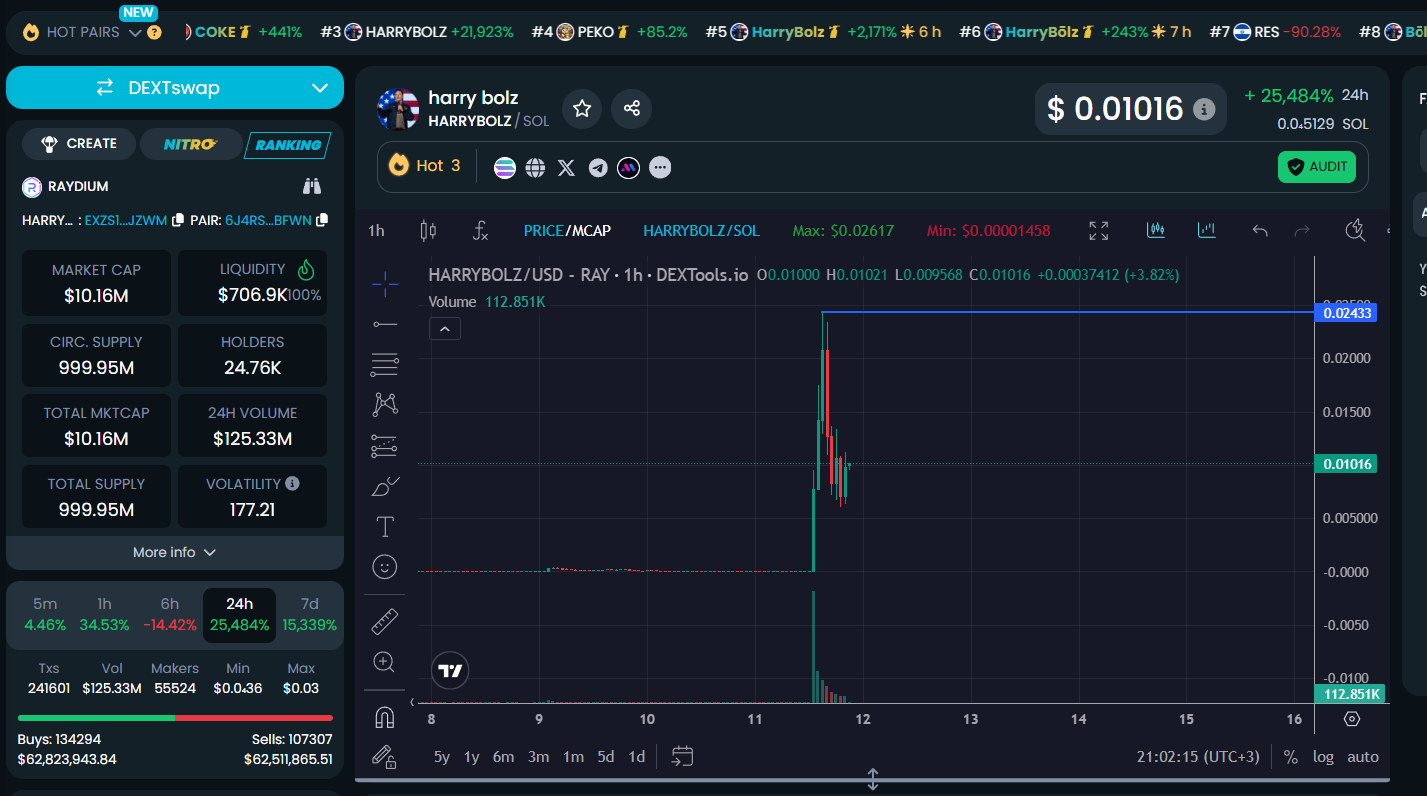 Bu son gelişmeler ışığında HARRYBOLZ isimli bir memecoin’in 0.025 dolar seviyelerine ulaştığı görüldü. 25 milyon dolar piyasa değerine ulaşan bu memecoin, ilerleyen saatlerde ise tekrardan düşüşe geçti.
