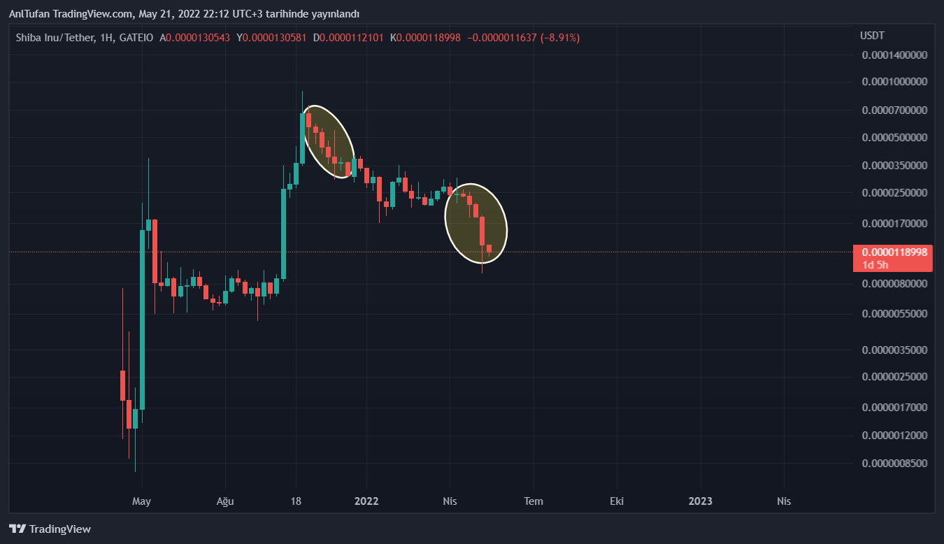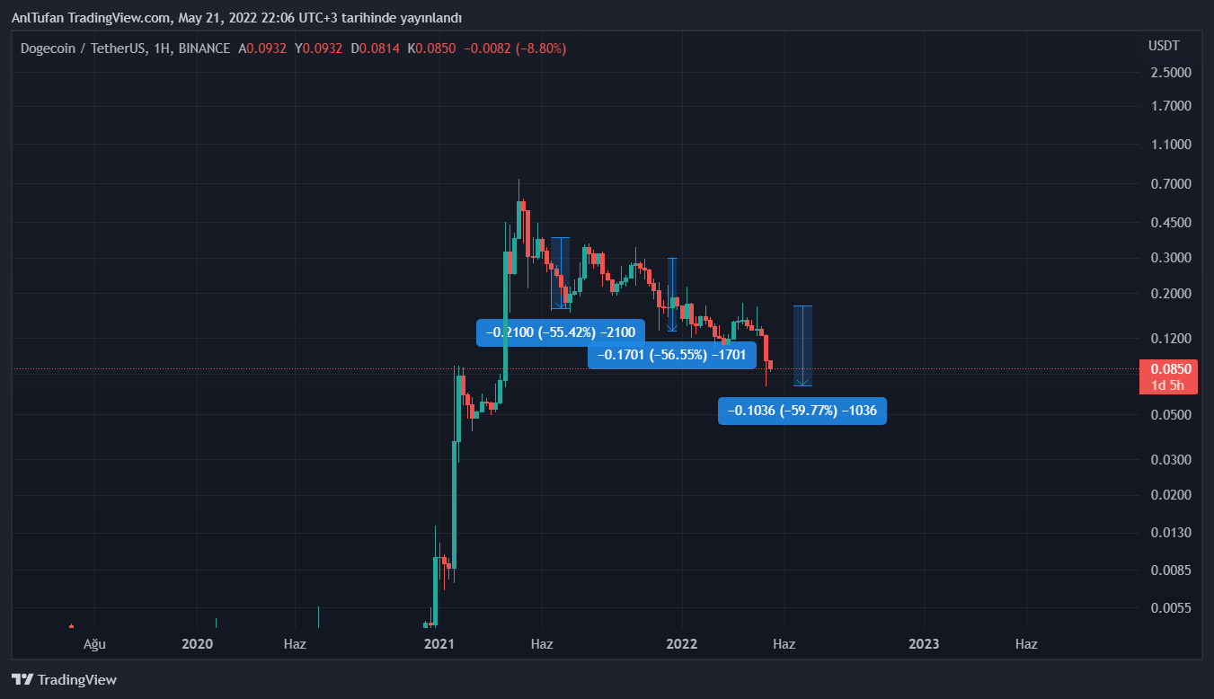 2021 yılında yaşanan boğa sezonunun ardından art arda en fazla %56’lık bir düşüş yaşayan DOGE, an itibariyle %59’luk bir değer kaybına uğramış durumda.