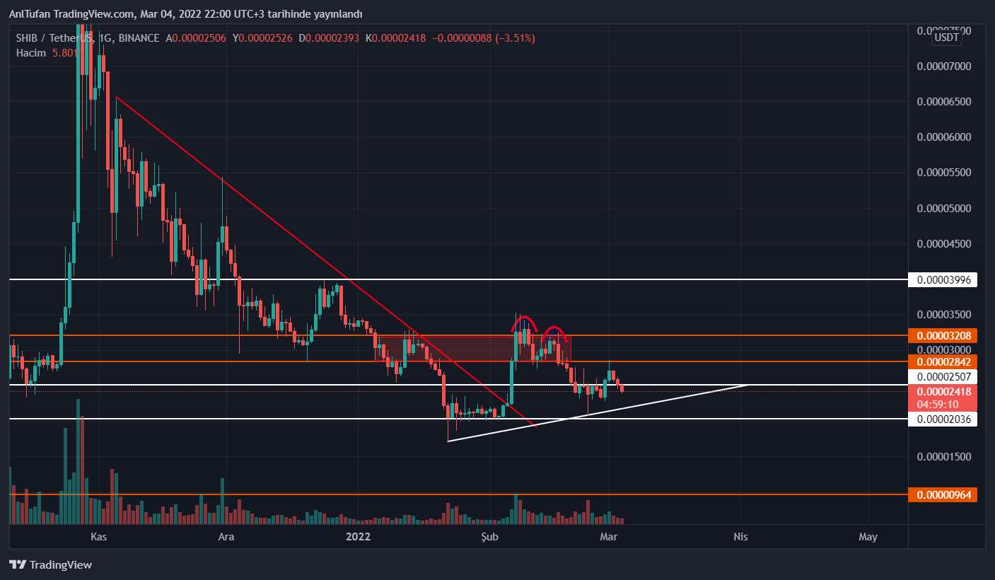 Düşüşün devam etmesi halinde yükselen trend desteği olan 0.00002200 dolara kadar gerilemesi beklenen Shiba Inu, bu trend desteğinin üzerinde kalamaması durumunda ise 0.00002000 dolar major desteğine gerileyebilir.