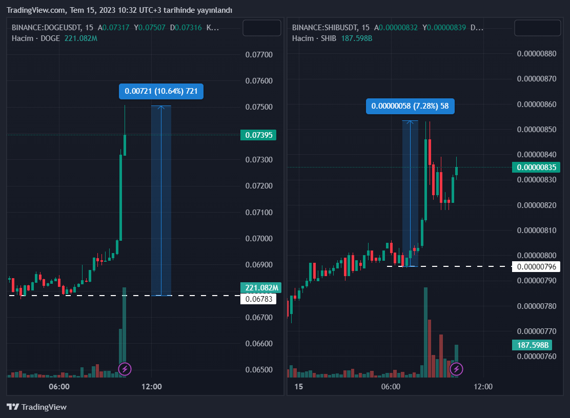 Bu sabah itibariyle Dogecoin (DOGE) yüzde 10’luk bir sıçrama yaparken, Shiba Inu’nun (SHIB) ise yüzde 7 oranında değer kazandığı görüldü. PEPE ve FLOKI ise kayda değer bir yükseliş yaşamadı.