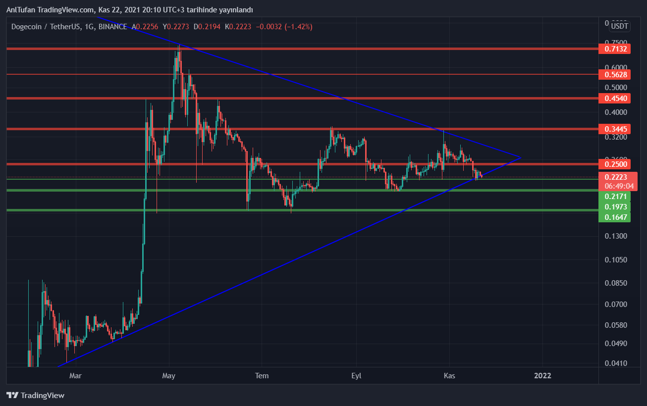 Üçgen formasyonu aşağı kırıldığı senaryoda önce 0.217 ara destek ve 0.197 ana destek seviyelerine kadar gerileyebilecek olan ünlü memecoindeki