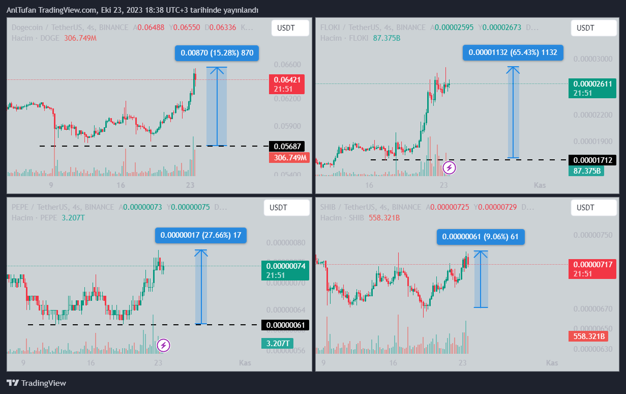 FLOKI bu süreçte %65’lik sıçrama gerçekleştirirken, PEPE ise %27 oranında artış yaşadı. DOGE’nin yükselişleri ise %15’de kalmış durumda.