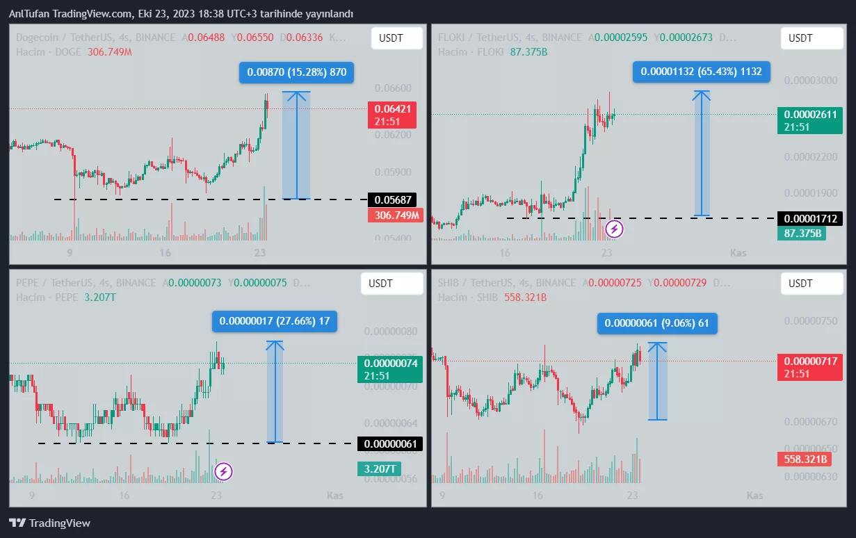 FLOKI bu süreçte %65’lik sıçrama gerçekleştirirken, PEPE ise %27 oranında artış yaşadı. DOGE’nin yükselişleri ise %15’de kalmış durumda.