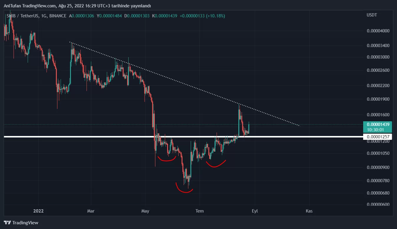 10 Mayıs – 10 Ağustos tarihleri arasında Ters Omuz Baz Omuz (TOBO) formasyonuna benzer bir bullish patern oluşturan SHIB, 14 Ağustos’ta bu akümülasyon sürecini yukarı yönlü kırmayı başarmıştı.