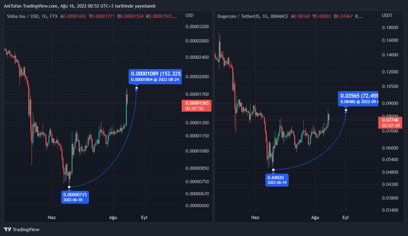 Dogecoin dip seviyeden yüzde 75 oranında yükseliş yaşadığı görülürken, Shiba Inu‘da bu oran dün gelen yükselişlerle birlikte yüzde 150’ye ulaştı.