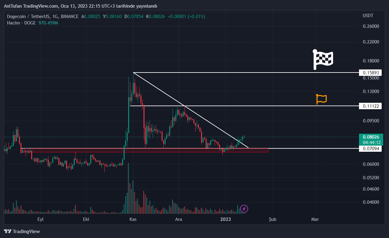 Haberimizin yazıldığı esnada 0.08028 dolar seviyelerinden işlem gören DOGE, 1 Kasım tarihinden beri altında olduğu düşen trendini yukarı kırmayı başardı.