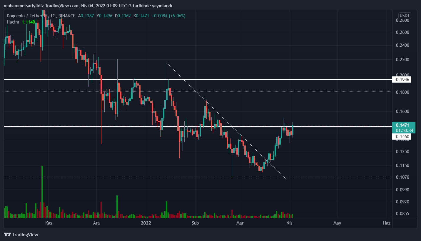 Haberimizin yazıldığı esnada 0.1470 dolar seviyelerinde bulunan Dogecoin, düşen trendini kırmasıyla birlikte yükselişe başlamıştı.