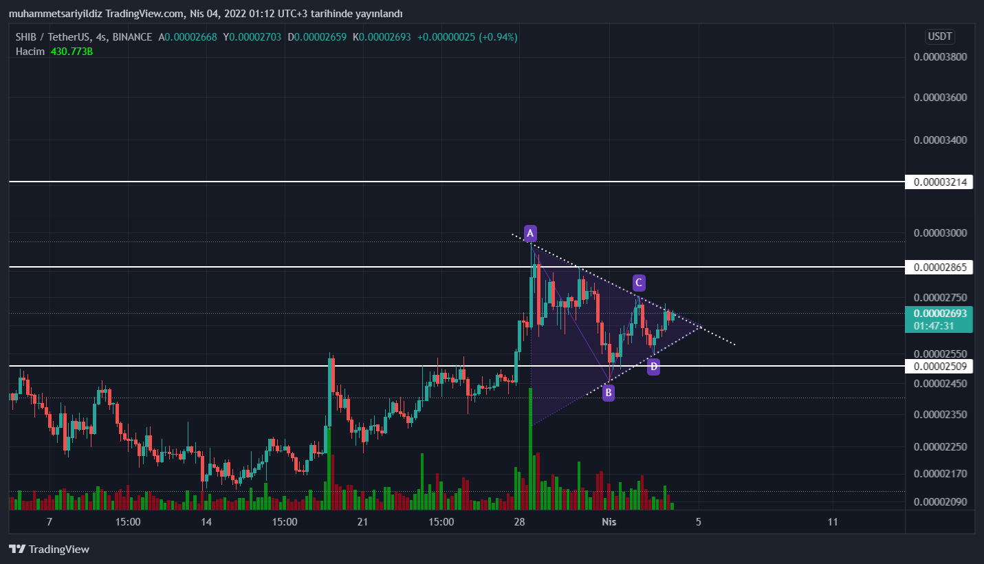 4 saatlik grafik üzerinde simetrik üçgen formasyonu oluşturan Shiba Inu, ilerleyen saatlerde 0.00002720 dolar seviyesi üzerinde kapanış yaptığı takdirde yükselişi başlatabilir.
