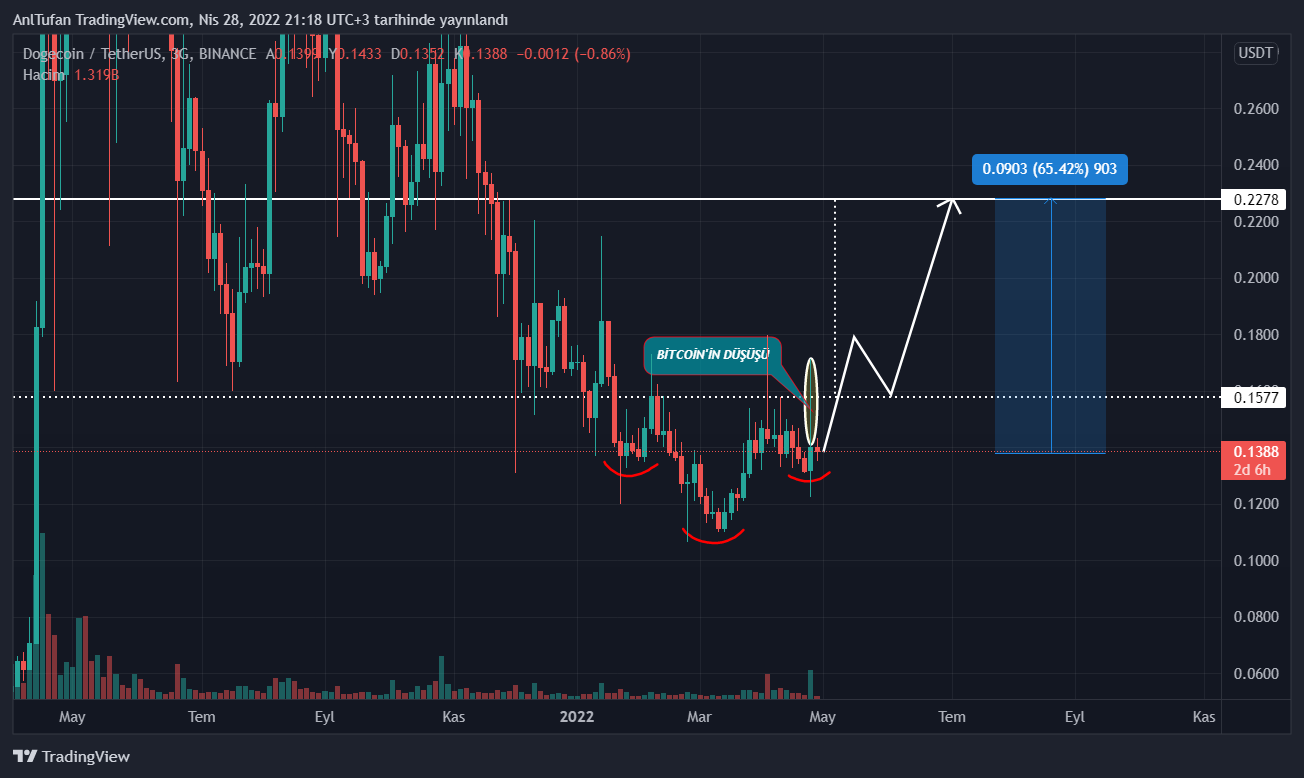 Haberimizin yazıldığı esnada 0.1387 dolar seviyelerinde bulunan Dogecoin, 3 günlük grafik üzerinde TOBO formasyonu oluşturduğu görülüyor.
