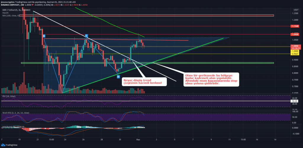 Son analizimizde günlük zaman diliminde belirttiğimiz kırmızı düşüş trendini yukarı yönlü hacimli bir şekilde kırmayı başaran XRP, kırılım sonrası ilk mumunu 1 dolar üzerinde kapatsa da bu seviyede tutunmaya çalışıyor.