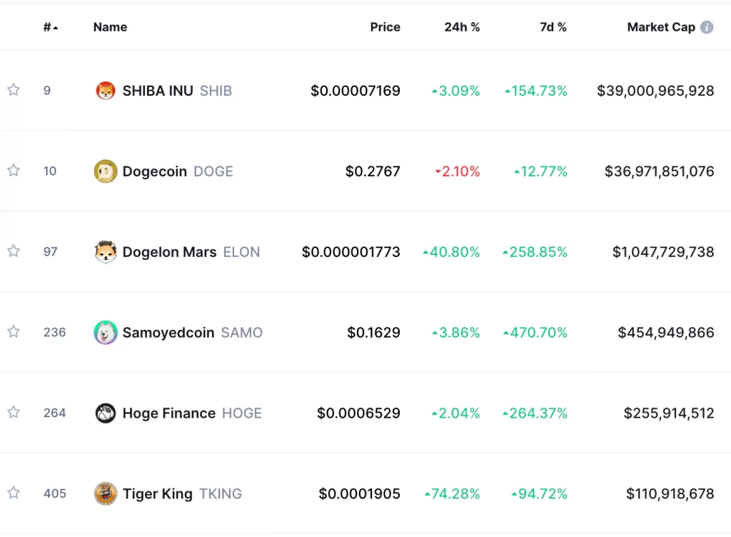 En büyük meme coin Doge’den ilham alınarak piyasaya sürülen kripto para birimlerinde inanılmaz derecede fiyat artışı yaşanıyor. Özellikle Shiba Inu (SHIB) ve Floki Inu (FLOKI) en iyi performans gösteren taklitçi meme coinlere örnek gösterilebilir. Adını Tesla CEO’su Elon Musk’tan alan bir diğer meme kripto para birimi ekim ayında %4.000 ile astronomik fiyat artışı yaşadığı bilinmekte.