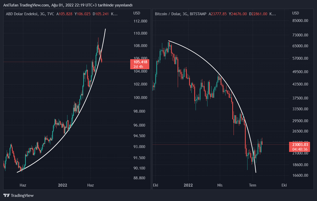 FED’in bu faiz artışları, ABD dolar endeksinin (DXY) sert bir şekilde yükseliş yaşamasını sağlamış olsa da, ABD borsalarının ve kripto para birimlerinin değer kaybetmesine yol açtı.