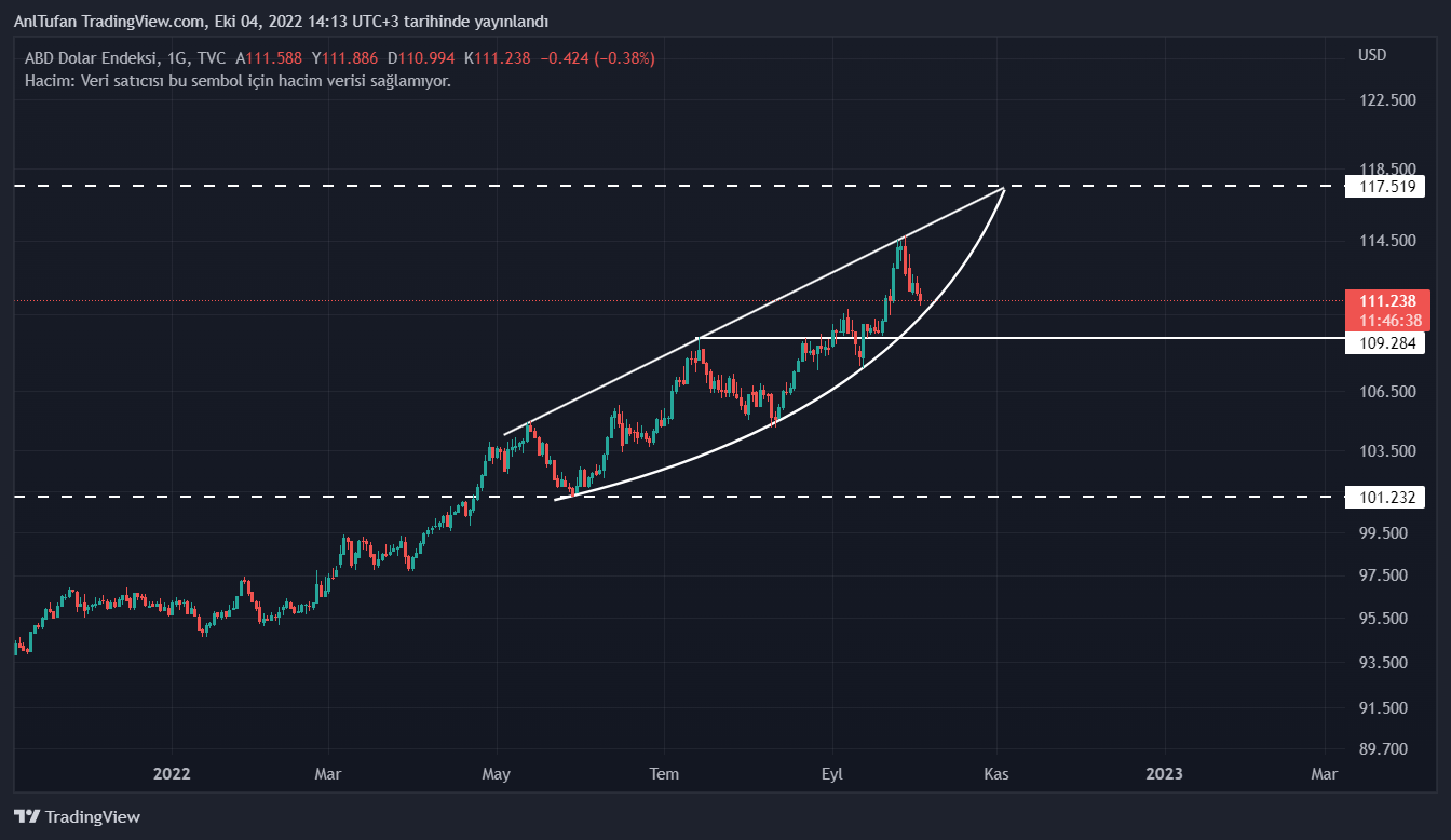 DXY’nin günlük grafiğini incelediğimiz takdirde ise artık yükseliş trendinin sonlarına çok yaklaştığımız görülüyor.