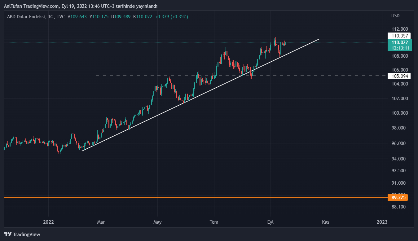 Amerikan Merkez Bankası (FED) piyasa beklentileri doğrultusunda 75 baz puanlık bir faiz artışı gerçekleştirirse, DXY 110 dolar seviyelerinden düşüşe geçebilir.