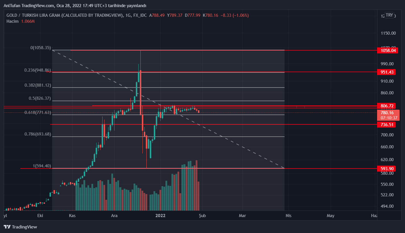 806 – 800 Türk Lirası direnç bölgesinden düşüşe başlayan Gram Altın, 779 Türk Lirası seviyelerine kadar bir gerileme yaşadı. 771 Türk Lirası seviyelerine kadar bir düşüş yaşaması beklenen Gram Altın bu seviyelerde tutunabilir.