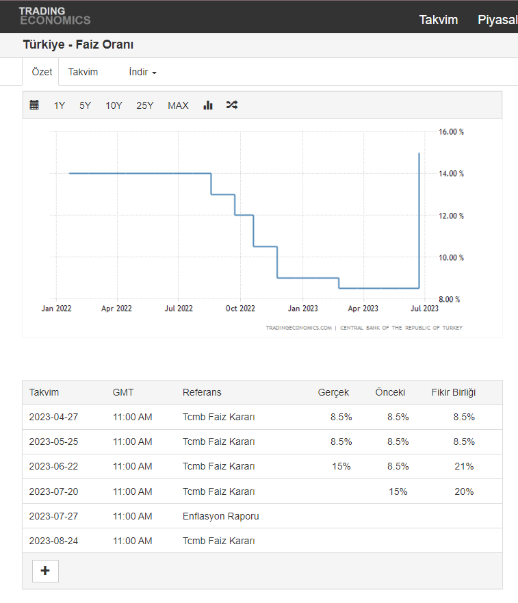 Başarılı bir veri sağlayıcısı olan TradingEconomics’in aktardıklarına göre şuan itibariyle finans piyasalarında TCMB’nin 500 baz puanlık bir faiz artışı yapması bekleniyor.