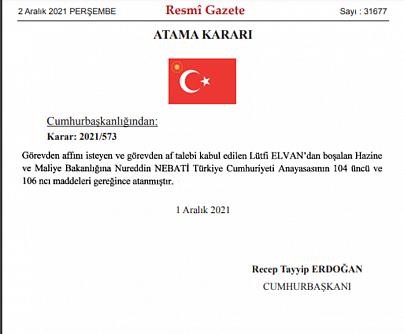 Lütfi Elvan, bakanlıktan istifasını Cumhurbaşkanı Recep Tayip Erdoğan’a sunmasının ardından, dilekçesi kabul edildi ve yeni Hazine ve Maliye Bakanlık Koltuğuna Nurettin Nebati getirildi.