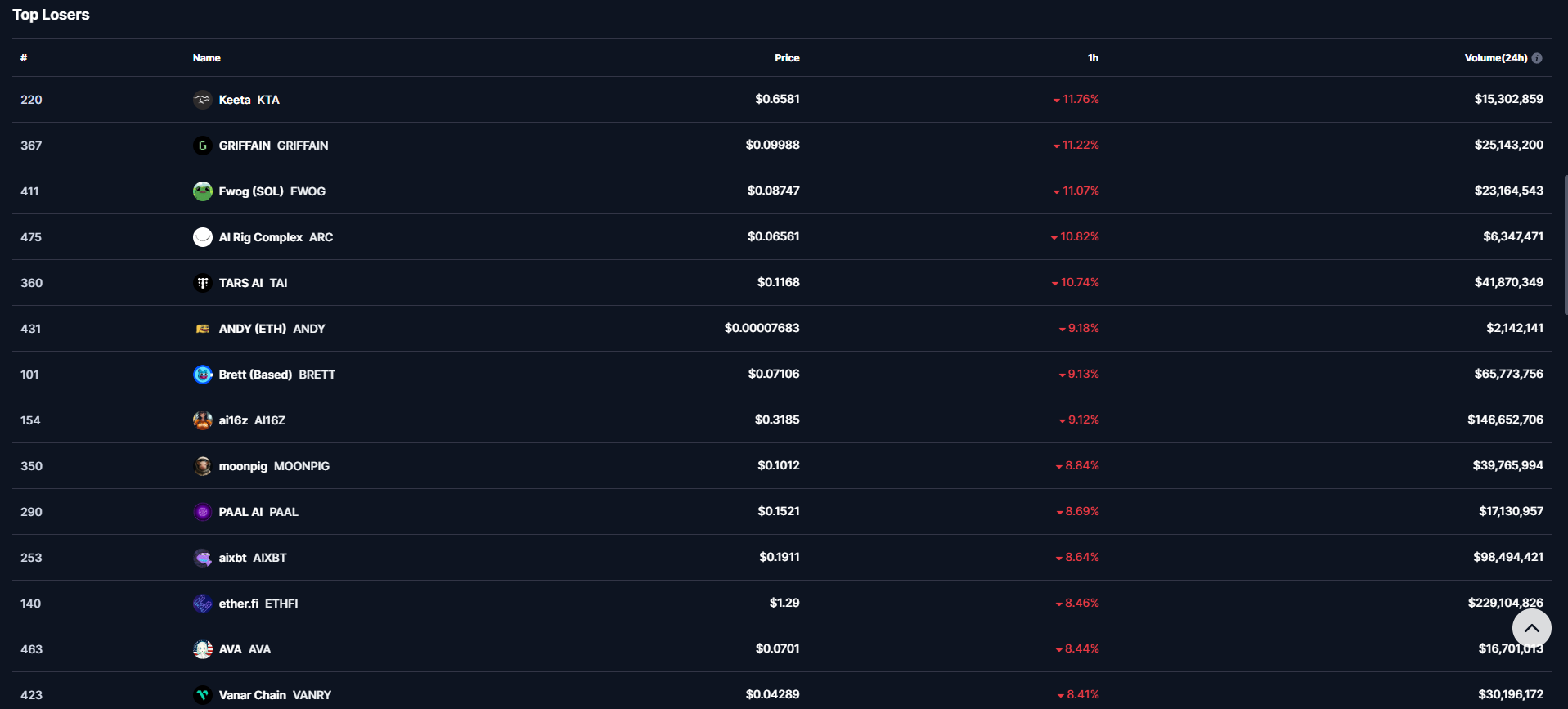 CoinMarketCap verilerine göre altcoin’lerde son 1 saat içerisinde ortalama %10’luk ani düşüşler yaşadı. Son 1 saat içerisinde en çok değer kaybeden altcoin’ler ise KTO, GRIFFAIN, FWOG, ARC ve TAI oldu.