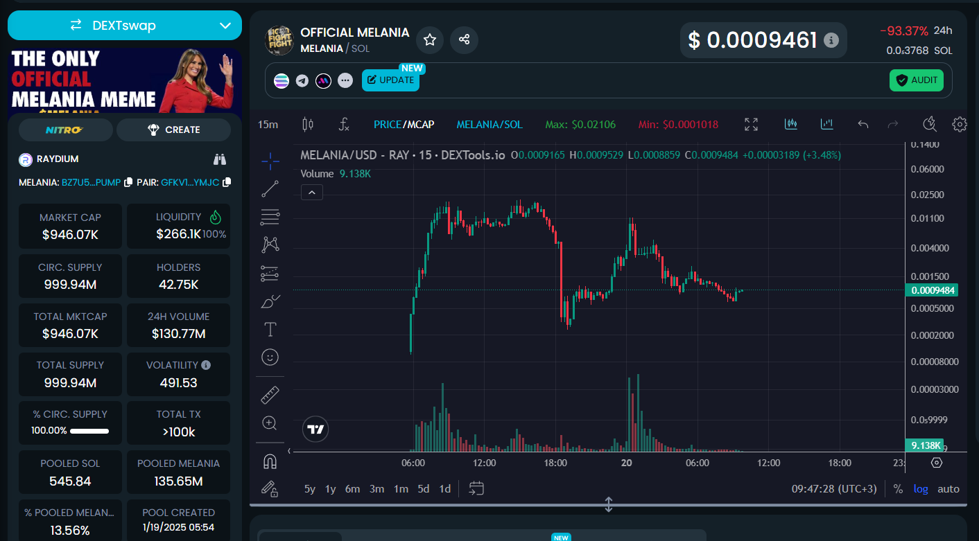 Yine de şuan itibariyle OFFICIAL MELANIA’nın (MELANIA) ortalama 1 milyon dolarlık bir piyasa değeri bulunuyor. Yatırımcılar Donald Trump’ın memecoin’i OFFICIAL TRUMP’a (TRUMP) yoğun ilgi gösterse de, MELANIA aynı ilgiyi yakalayamamış gibi gözüküyor.