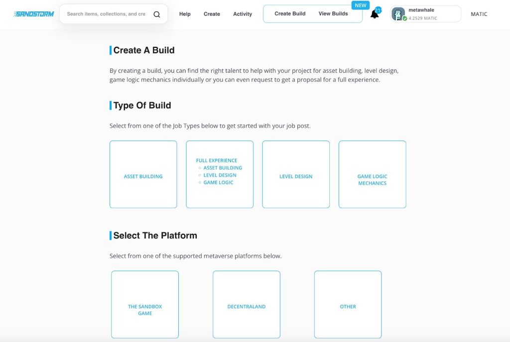SandStorm platformu, Beceriler, Kullanılabilirlik, İletişim, Kalite, Son Tarihler ve Ekip İşbirliğine dayalı inşaatçıları vurgular. Fiziksel dünyada bir rüya evi inşa etmeye benzetilebilir, ancak yerel bir gayrimenkul geliştirme firması kiralamak yerine, Kore’deki en iyi mimarı, Londra’daki en iyi çatı ustasını ve Kanada’daki en iyi elektrikçiyi seçmek tam da bu platform ile mümkün oluyor. Öte yandan sanal dünyada faaliyet gösteren markalar, müteahhitleri önceki iş portföylerine göre seçebilirler.