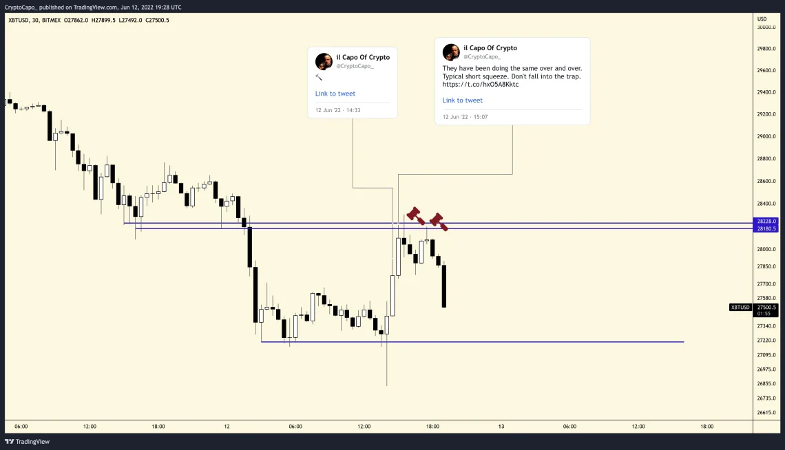 Hafta sonu boyunca Crypto Capo, Bitcoin‘in 27.500 dolardan 28.228 dolara kadar olan kısa yükselişlerinin, BTC‘de bilgisiz yatırımcıları tuzağa çekmek için gerçekleştiğini söylemişti.