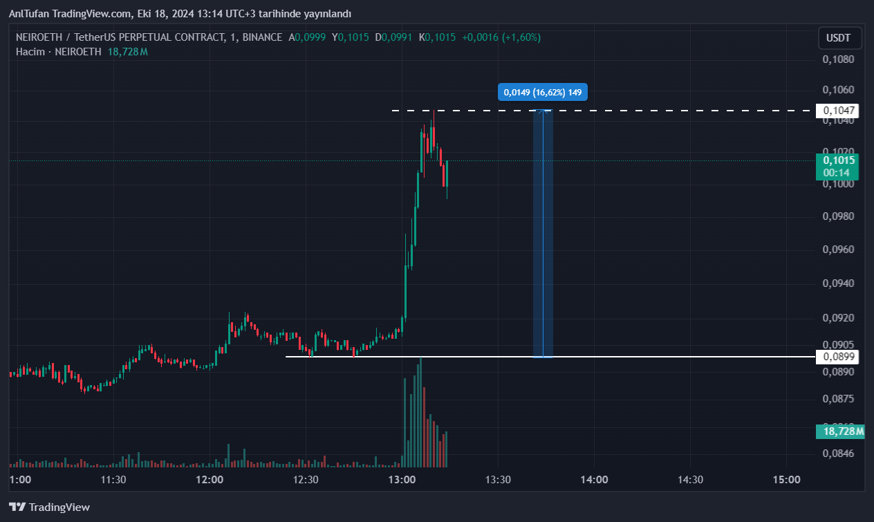 Dakikalar içerisinde vadeli piyasada 0.0899 dolardan 0.1047 dolar seviyelerine kadar %16’lık bir sıçrama yapan NEIROETH, yatırımcıların dikkatini üzerine çekti.