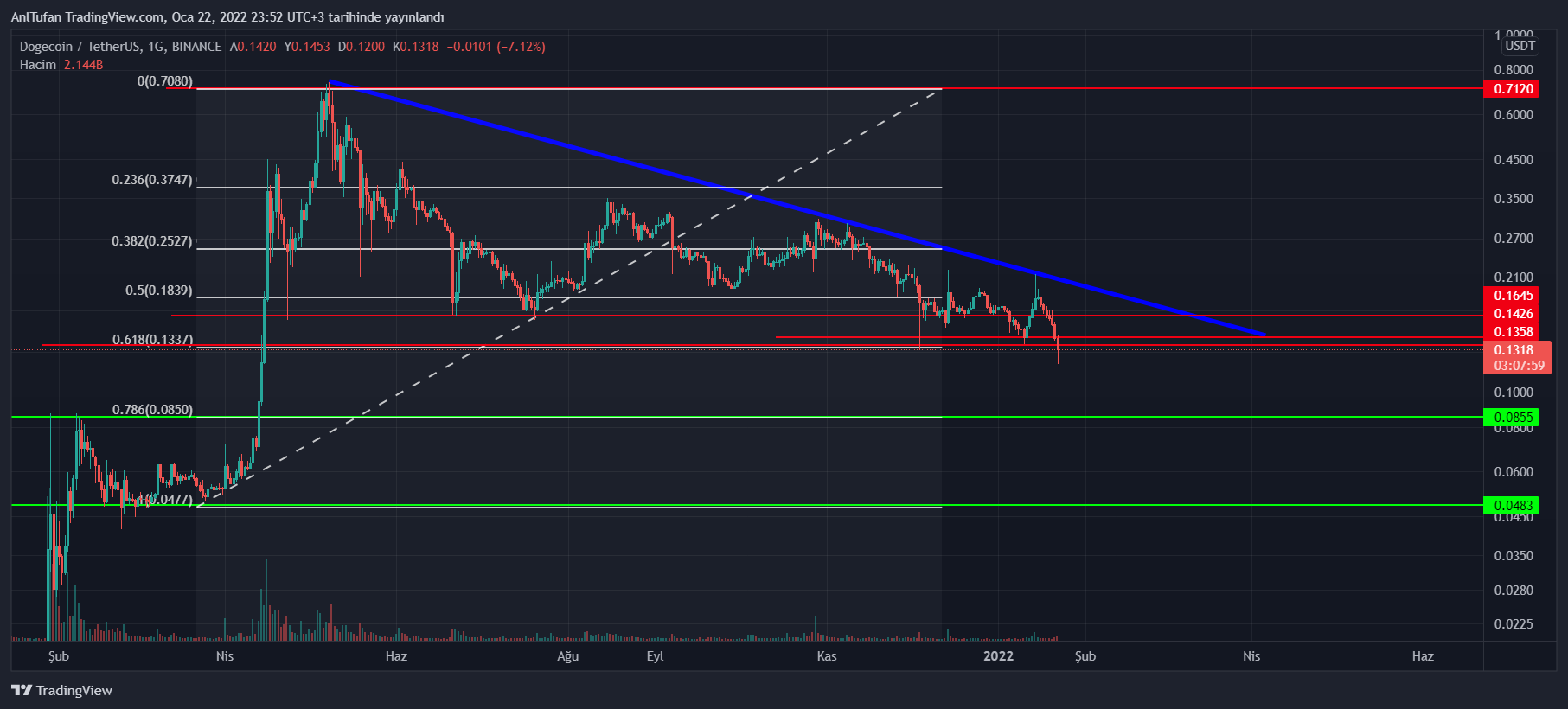 Böyle bir kapanış halinde tekrardan üst direnç seviyelerini deneyebilecek olan DOGE, fibonacci 0.618 desteği olan 0.1337 dolar ve 0.1358 dolar üzerinde kalamaması durumunda 0.085 dolar seviyelerine kadar çok daha sert düşebilir.
