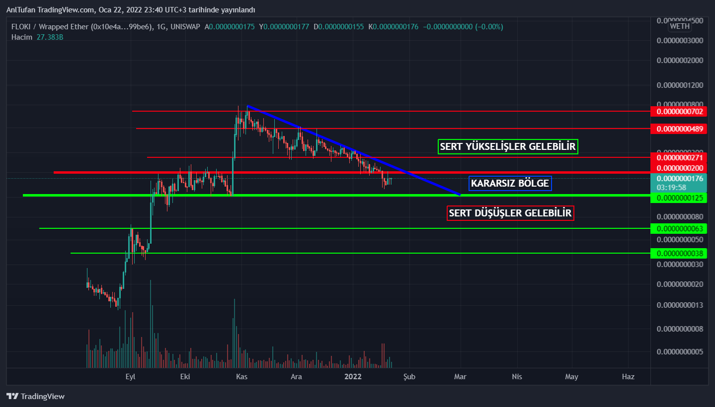 Yayın saati itibariyle 0.0000000176 WETH seviyesinde bulunan FLOKI, kararsız bir bölgede yer alıyor. Dolar cinsinden grafiğinin çok kısıtlı olduğu Floki Inu’yı, Wrapped Ether değeri karşısında incelemek daha doğru olacak.