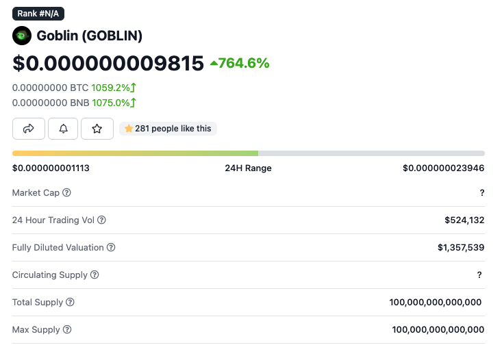 Kaçıncı sırada olduğu tam olarak bilinmeyen ve sirkülasyondaki miktarına dair de tam bilgi bulunmayan Goblin (GOBLIN) isimli kripto para, kısa süre önce %1.000’e yakın yükseliş elde etti.