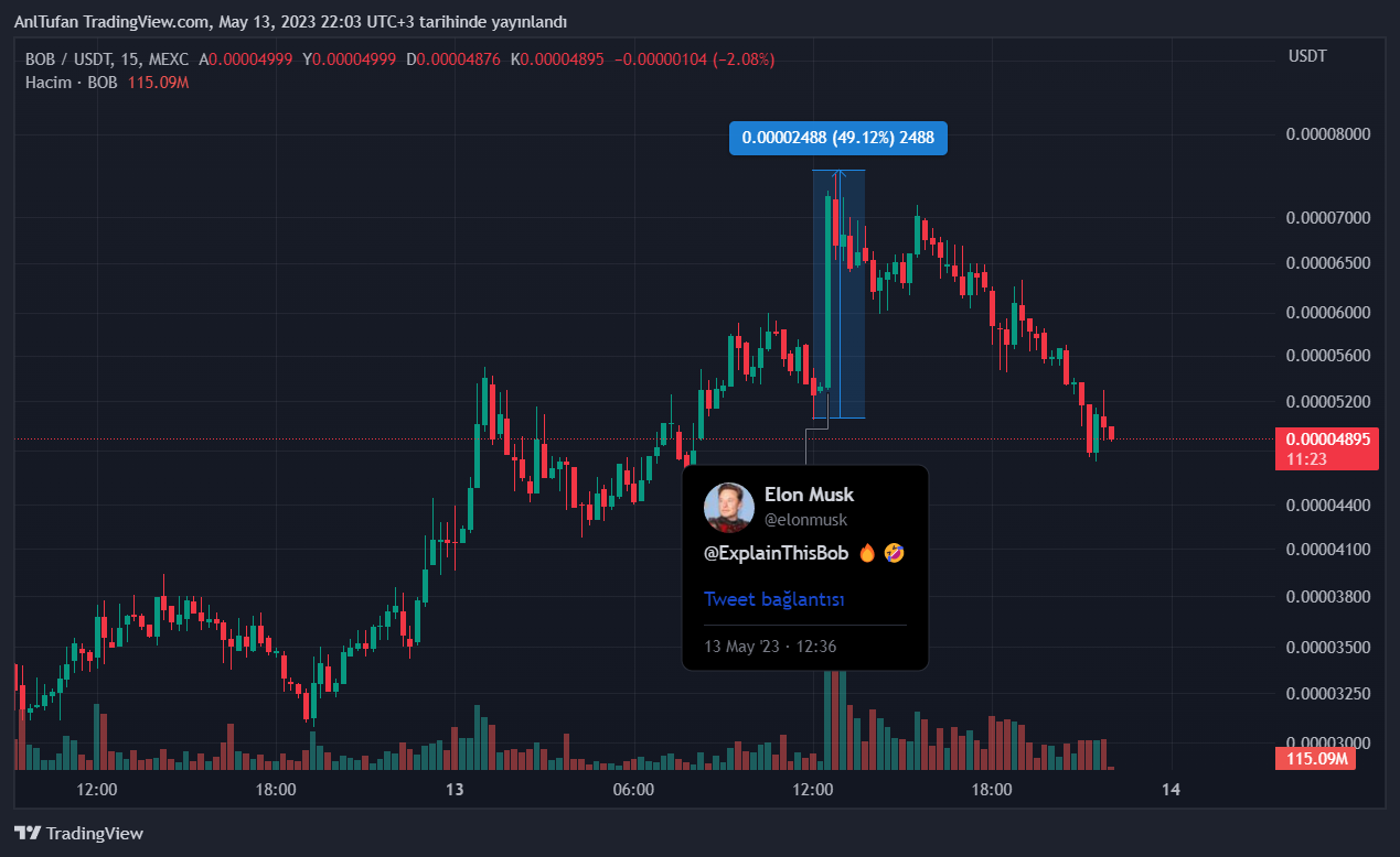 Elon Musk’ın BOB meme coin’inin Twitter hesabının paylaşımına alev ve gülme emojisi göndermesi, BOB’un volatil bir şekilde yükselişe geçmesini sağladı.