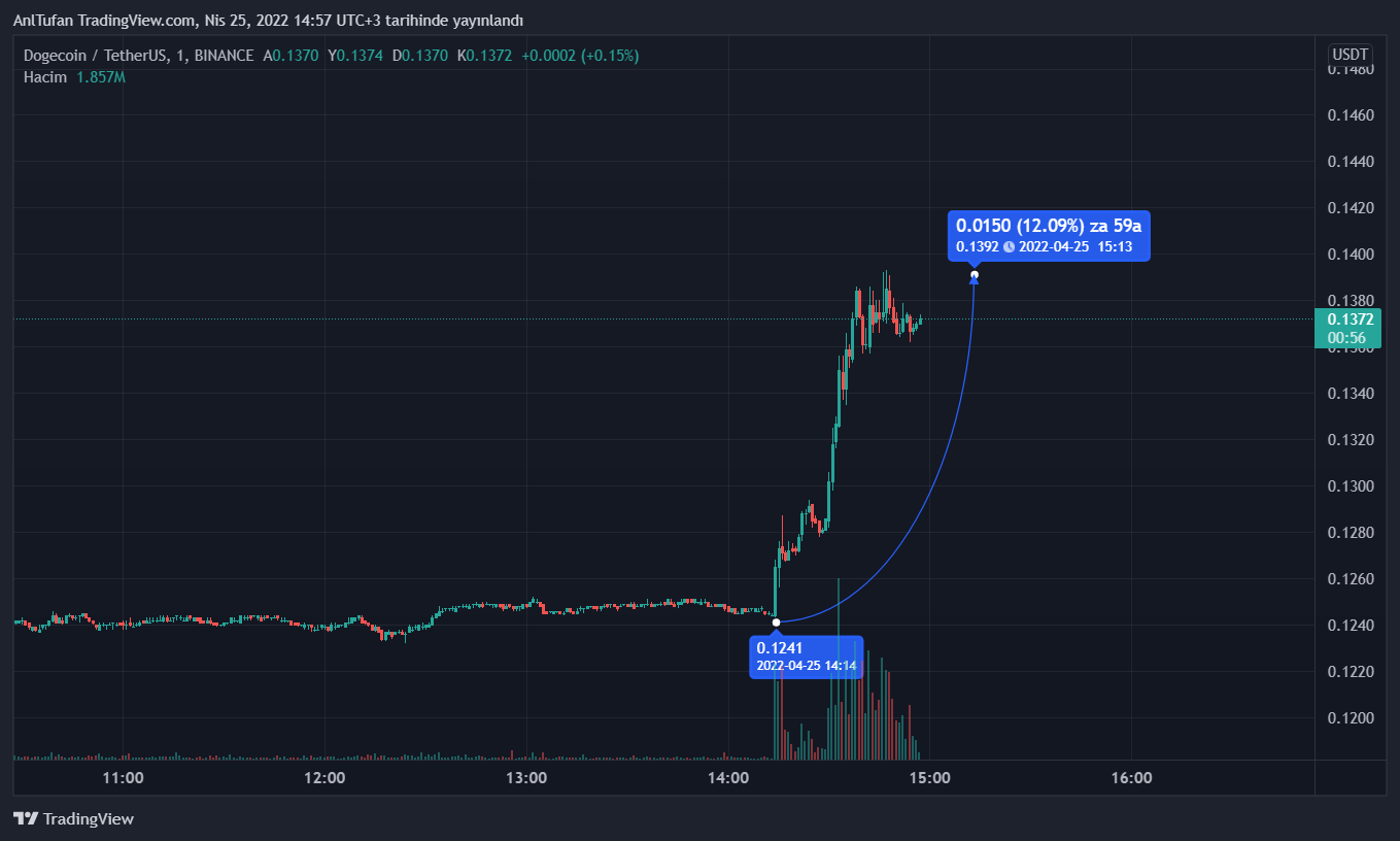 Elon Musk’ın Twitter’ı satın alması en çok Dogecoin‘e yarayacak gibi gözüküyor. Gelişen haberler yine DOGE‘nin sert bir şekilde yükselmesini sağladı.
