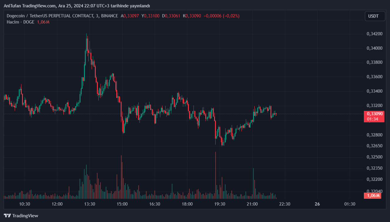 Son dönemde bu etkisini yitirmiş gibi gözüken Musk, son paylaşımında da DOGE fiyatı üzerinde büyük bir etki yaratamadı. Haberimizin yazıldığı esnada 0.330 dolar seviyelerinden işlem gören DOGE, son dakikalarda bir hareketlilik yaşamadı.