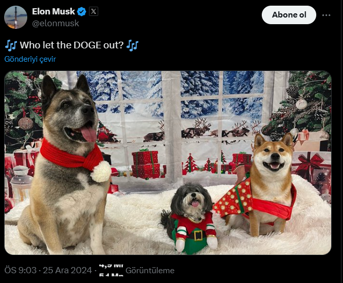 Resmi X/Twitter hesabı üzerinden 3 adet yılbaşı kostümleri giydirilmiş köpek fotoğrafıyla noeli kutlayan Elon Musk, bu köpeklerin bir tanesine ise Dogecoin (DOGE) sembollerinin olduğu pelerin giydirdiği görüldü.