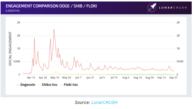 LunarCRUSH tarafından aktarılan bilgilere göre özellikle 9 Mayıs tarihinde DOGE ile ilgili sosyal medya aktivitesi 1,76 milyar adeti görürken SHIB ise 122 milyonu görmüştü. Ancak şimdiki duruma bakıldığında DOGE, DOGE kopyası SHIB ve SHIB kopyası FLOKI’nin sosyal medya aktivitesinde dibe ulaştığı görülüyor. Tamamen sosyal etkileşimden faydalanan bu üç altcoinin böyle bir durumda sert bir düzeltme yaşaması ise içten bile değil.