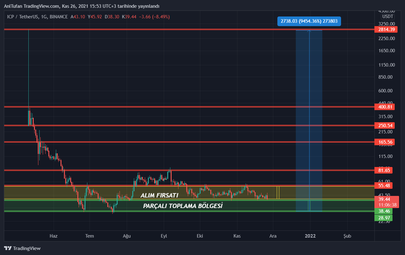 Yayın saati itibariyle 39.89 dolar seviyelerinde bulunan ICP alım fırsatı olarak tabir ettiğimiz bölgenin en alt kanadında yer alıyor. İlk listelenmeyle beraber 2.814 dolar seviyelerine kadar yükselmiş olan ICP bu seviyelerden 26 Kasım tarihine kadar sert düşüşler yaşamıştı.
